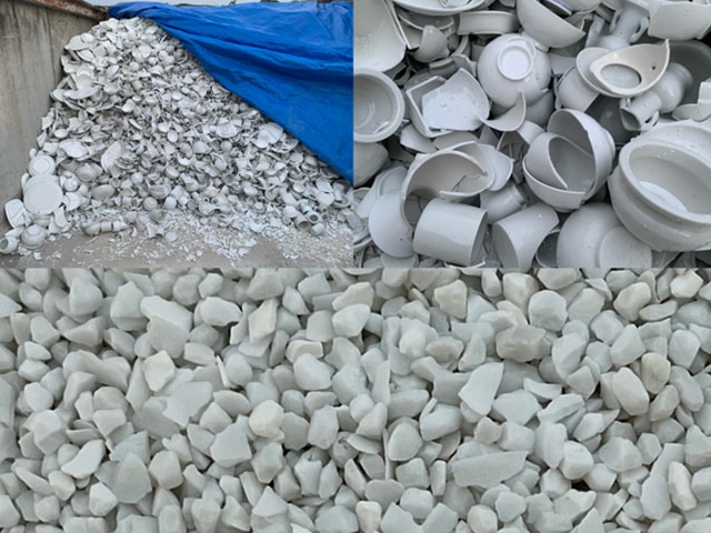 地場産業である陶磁器業界の廃棄物(白色のみ)を原料として購入し、粉砕・分級し白色セラミックス骨材(セルベン)として再生利用しています。