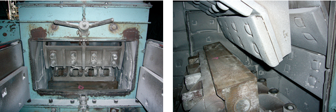 投入された原鉱は、高速で回転している打撃板から衝撃を受け、衝撃板に投げつけられ、また撥ね返ってくる時に原鉱同士で衝突し破砕されます。