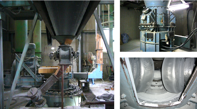 粉砕用ローラーにより、原料同士を磨り潰して粉砕(磨砕)する要領です。同形式のレイモンドミルと比べると、金属片の混入が少ないと言われています。
